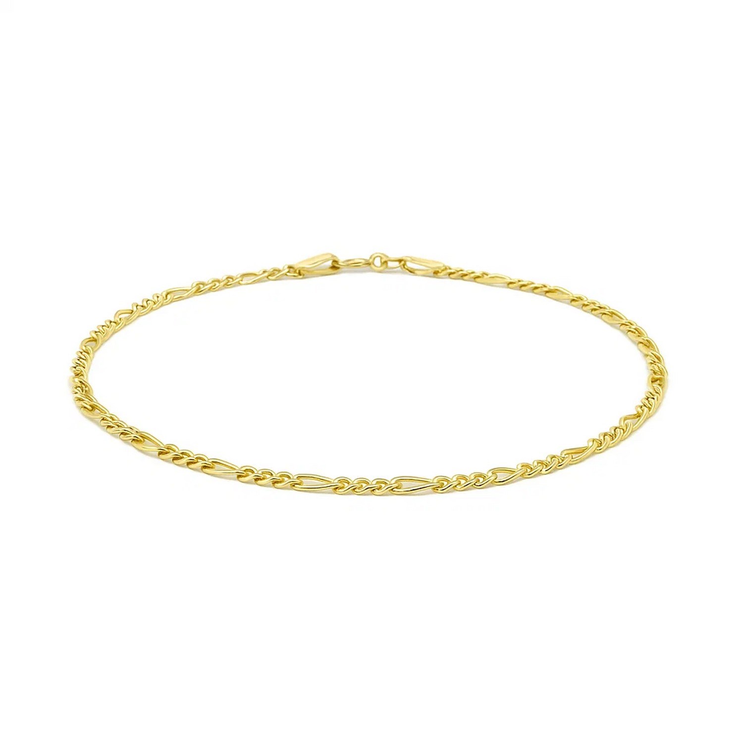 Crafted in glistening 14k yellow gold, this Figaro bracelet has a width of 1.9 millimeters and is secured with a spring ring clasp