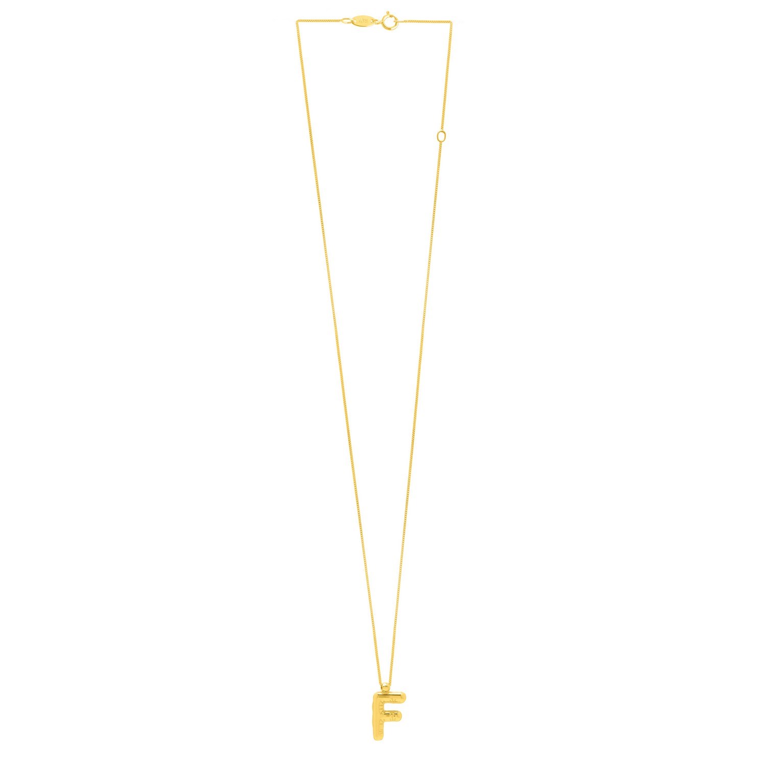 A lightweight 14K yellow gold initial F pendant featuring a sleek, airy design. Perfect for everyday wear or layering, it brings a simple, personalized touch to any jewelry collection.