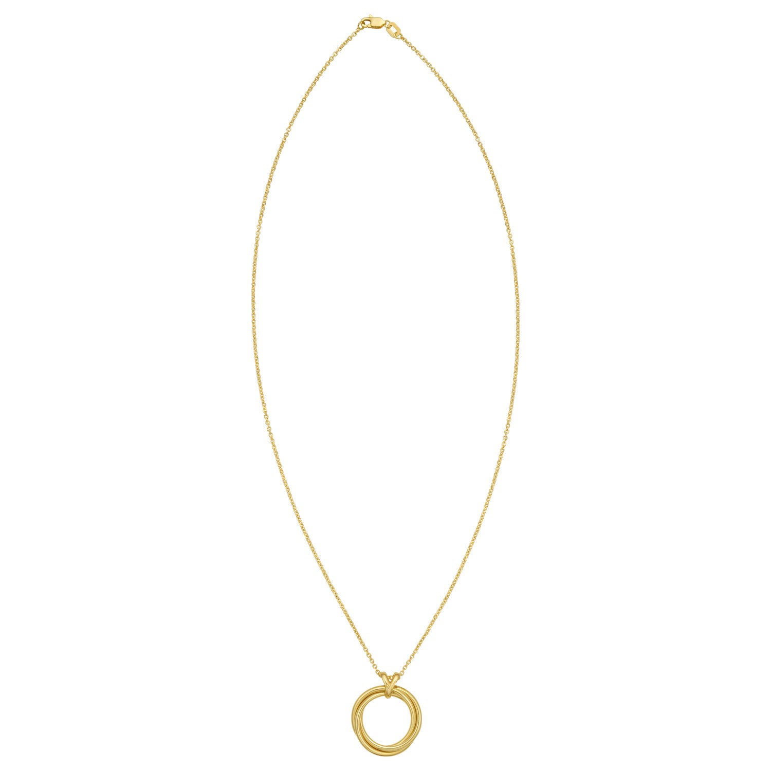 Elevate your elegance with this 14K yellow gold necklace, featuring interlocking polished trinity circles. Measuring 18 inches, it secures with a lobster clasp, offering both style and comfort. This timeless piece adds sophistication to any ensemble, making it perfect for everyday wear or special occasions.