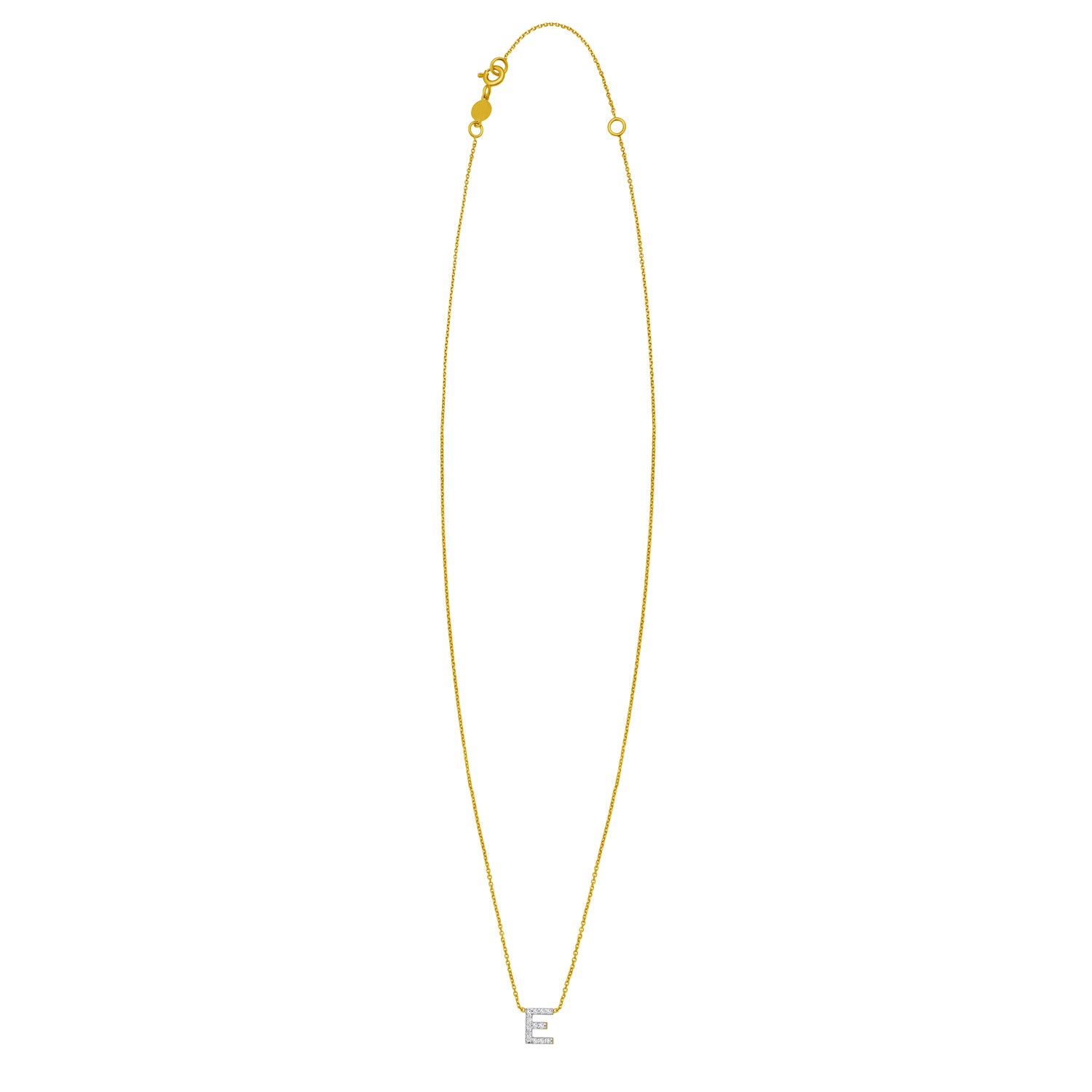Celebrate individuality with this 14K yellow gold mini diamond E initial pendant. Adorned with sparkling round diamonds, this dainty yet elegant piece adds a personal touch to any look. Perfect for everyday wear or as a thoughtful gift, it comes with an 18 inches chain and a secure spring ring clasp for lasting beauty and comfort.