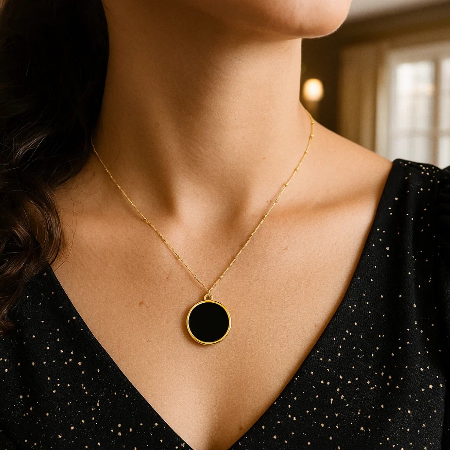 Elevate your elegance with this stunning 14K Yellow Gold Onyx Inlay Circle Necklace. Designed with modern minimalism in mind, the piece features a sleek circular pendant accented with a rich black onyx inlay—creating a bold contrast against the warm shine of 14K yellow gold. The pendant is gracefully suspended from an 18 inches chain, with a jump ring at 16 inches for versatile styling. The necklace is secured with a classic spring-ring clasp, offering both comfort and reliability for all-day wear.