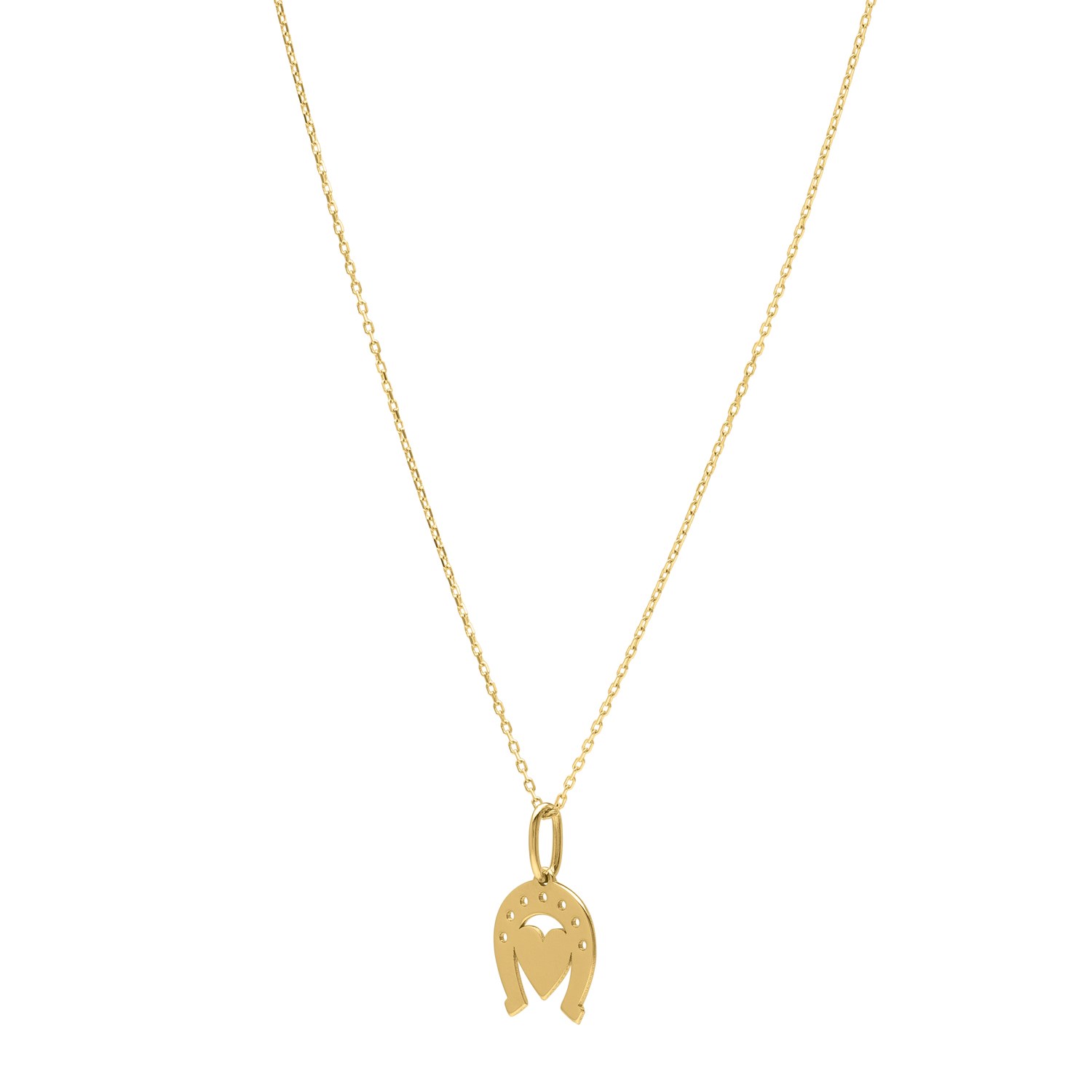 Luck meets love in this captivating 14k yellow gold horseshoe and heart pendant. A polished horseshoe gracefully encircles a heart, symbolizing a harmonious blend of fortune and affection. Complete with a matching chain, it’s the perfect way to carry a little luck and love wherever you go. Secured with a lobster clasp closure.