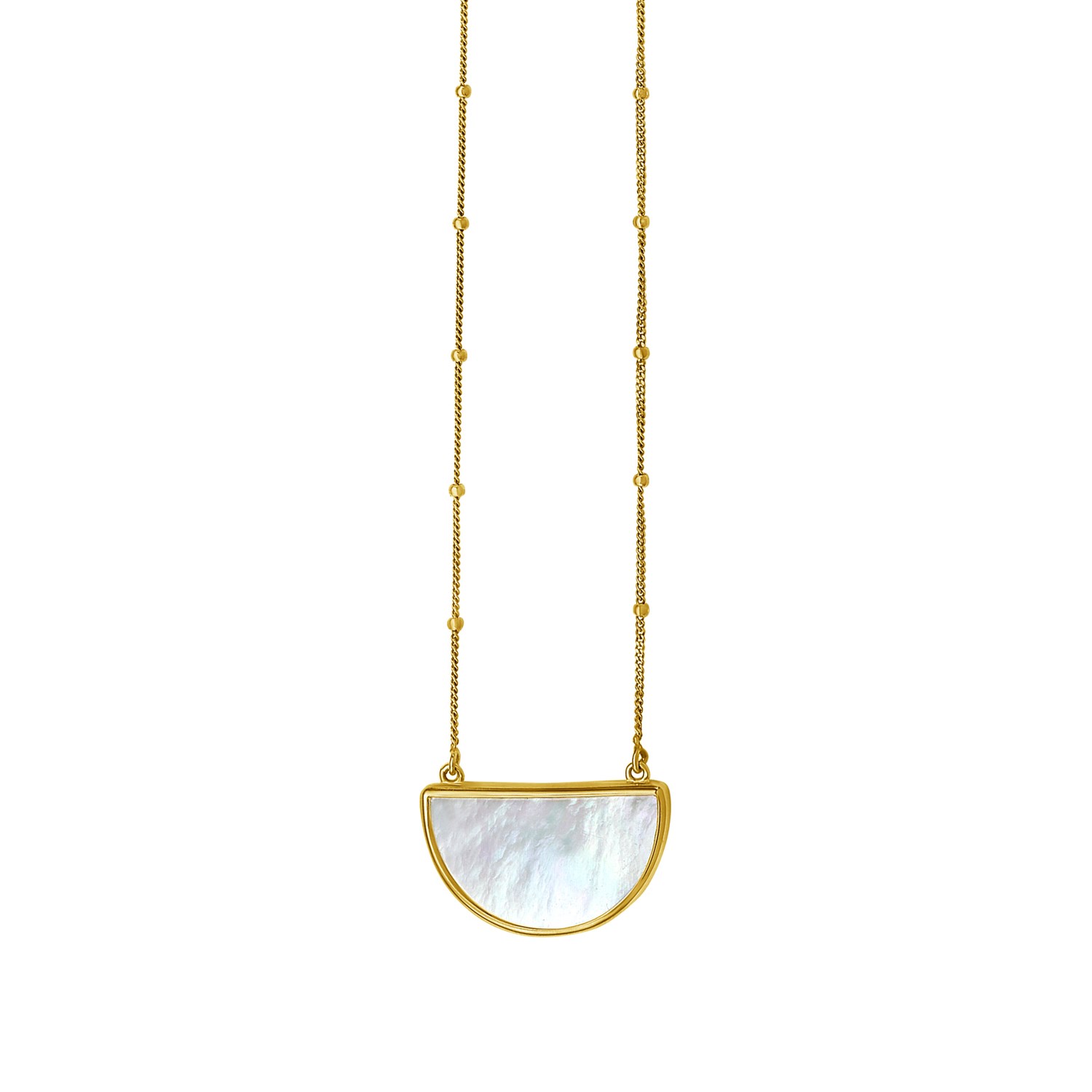 This 14k yellow gold necklace captures radiance with its half-moon white mother-of-pearl pendant framed in polished gold. The luminous quality of the mother-of-pearl reflects light beautifully, creating a soft, iridescent glow. Suspended on a delicate beaded station chain, this 18 inches necklace blends refined detail with a subtle celestial allure. Secured with a spring ring clasp closure.