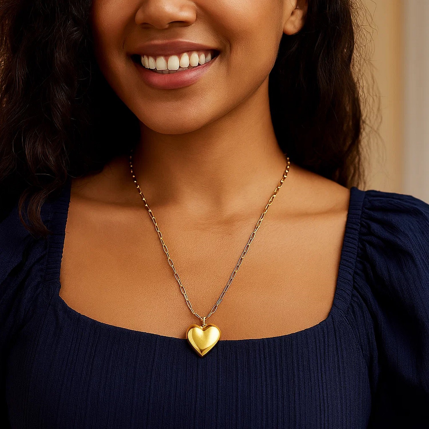 Beautifully crafted in sterling silver and finished with warm gold plating, this puffed heart pendant showcases a smooth, rounded silhouette full of charm and elegance. Its timeless design makes it perfect for everyday wear or heartfelt gifting. Classic, radiant, and effortlessly romantic.