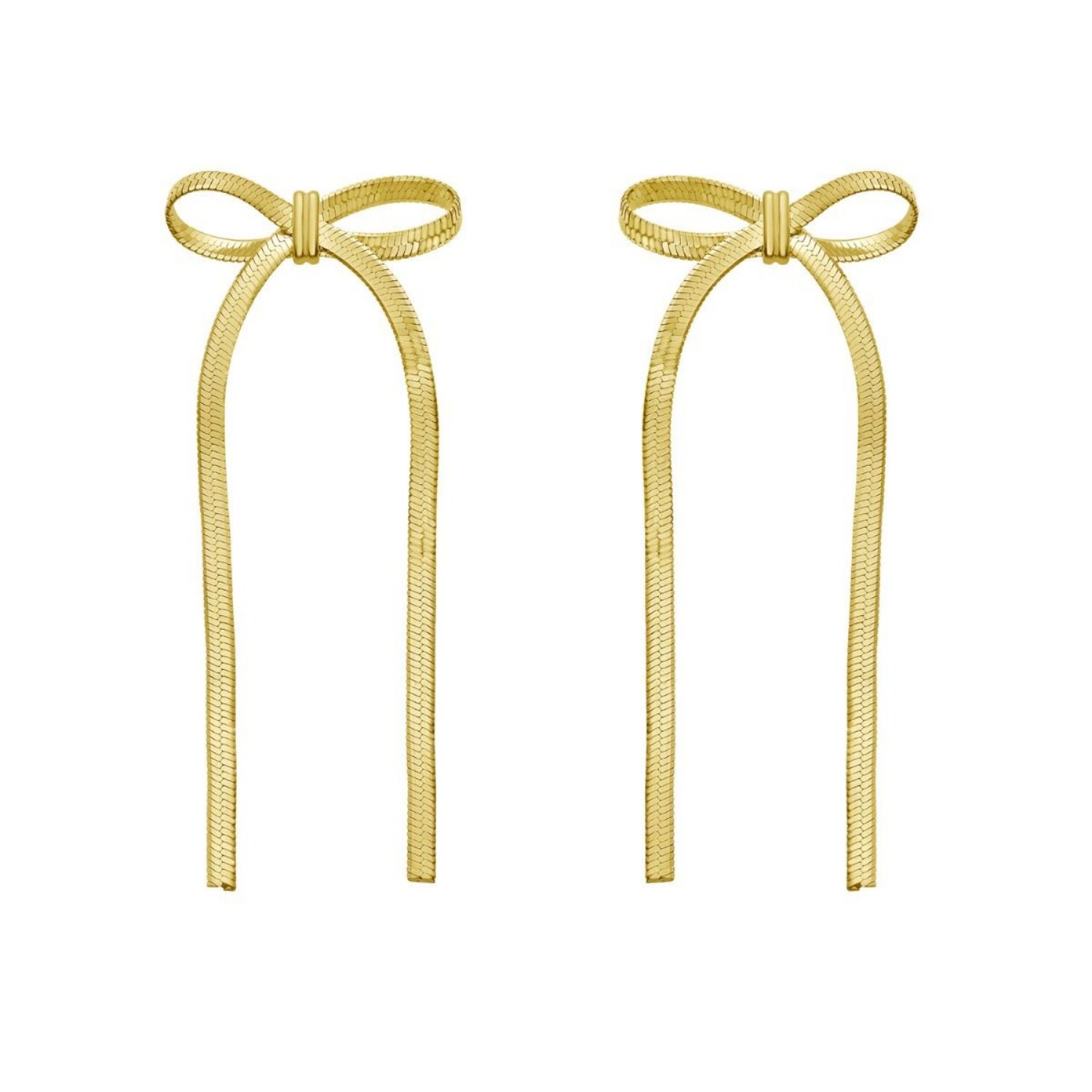 Elegant sterling silver yellow gold plated snake chain drop dangle bow earrings featuring a delicate bow design with flowing chain drops. The polished gold finish adds warmth and radiance, creating a graceful and sophisticated look for any occasion.