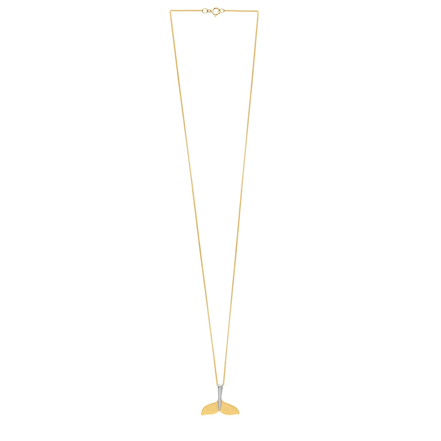 Inspired by the majesty of whales, this 10k two-tone gold necklace features a polished whale tail pendant. Symbolizing freedom, strength, and a connection to the ocean, the pendant is elegantly suspended on an 18 inches chain with a spring ring clasp. A meaningful piece that pays tribute to the grace and resilience of these magnificent creatures.